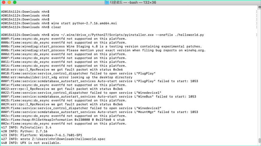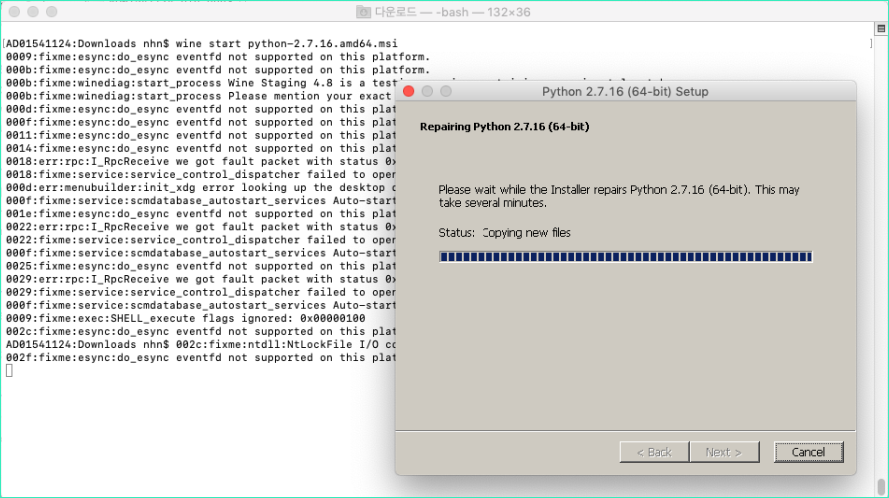물론 wine도 brew install wine으로 손가락 까딱해서 설치했다. 그리고 해당 명령어를 먹여줬더니 설치가 된다.