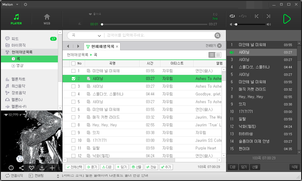 일단 멜론플레이어의 메모리에 우리가 필요한 키가 저장되야하므로 어떤 노래던지 한곡 재생해주자.