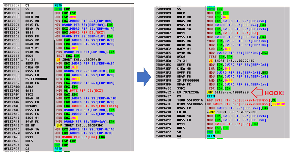 CRC검사를 하는 부분에 후킹을 하여 비교하는 주소가 Ehsvc의 영역이라면 Ehsvc.dll의 ImageBase를 빼고 FakeBaseAddr의 ImageBase를 더 해서 원본으로 계산하도록 수정.