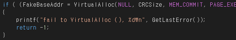 if ( (FakeBaseAddr = VirtualAlloc(NULL, CRCSize, MEM_COMMIT, PAGE_EXECUTE_READWRITE)) == NULL )