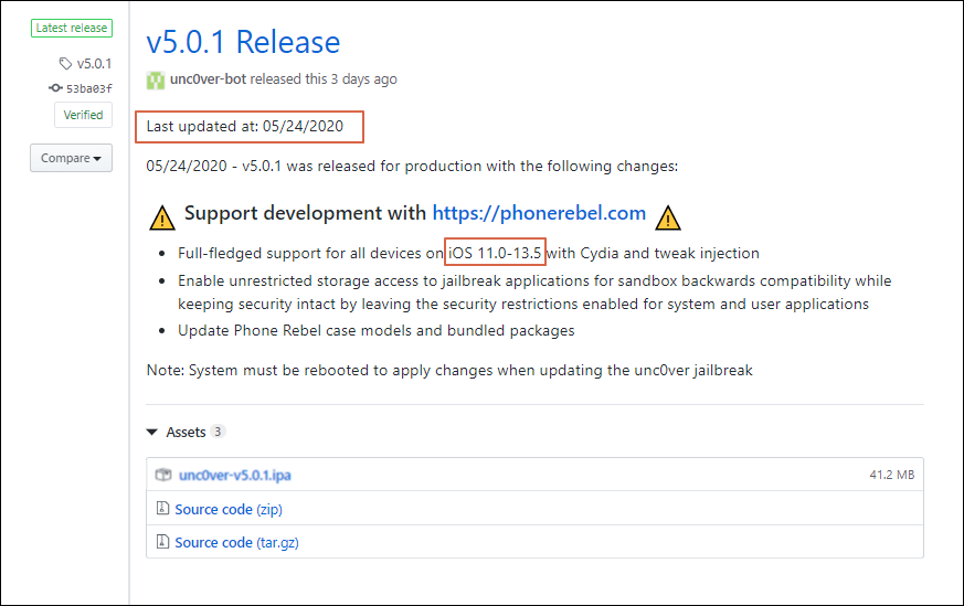 아이폰은 항상 최신버전이 있어야지만 탈옥이 되어 왔다. 이번에 예외로 최신 버전인 13.5까지 지원한다.