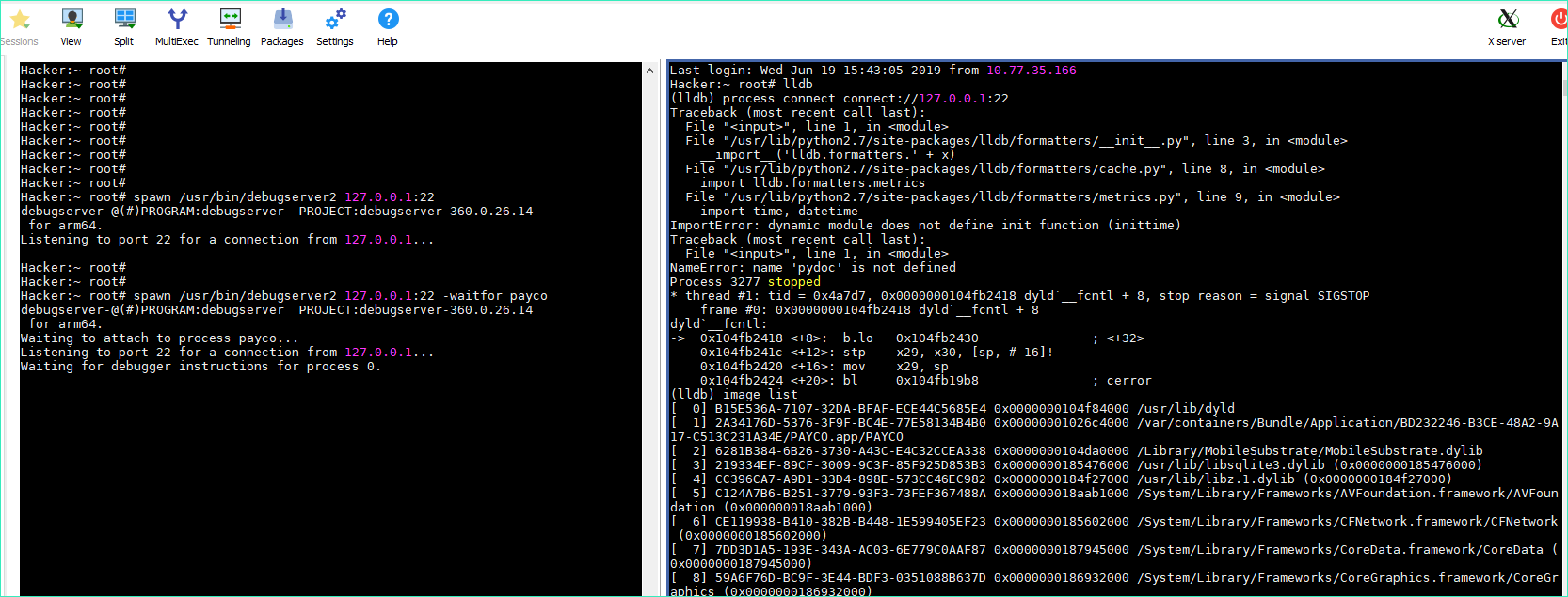 Ex) spawn /usr/bin/debugserver 127.0.0.1:22" -waitfor payco