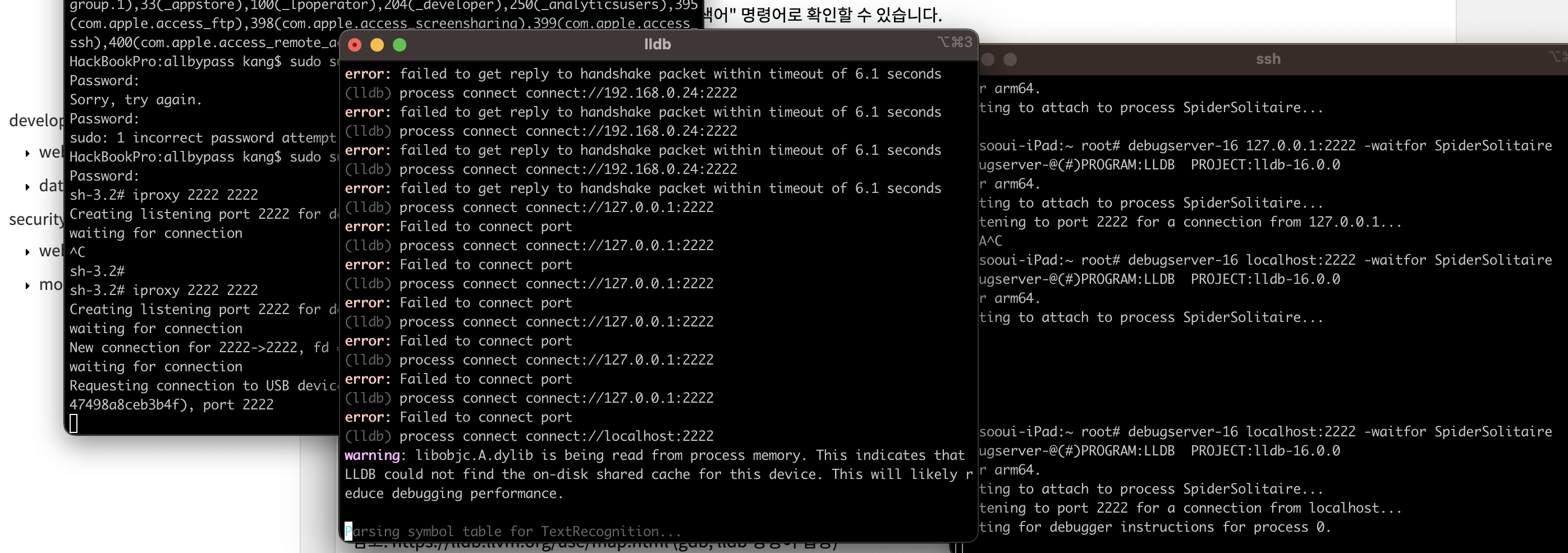 Step 4 : PC에서 아이폰의 프롬프트를 두개 연 뒤, 그중 하나에서 "spawn /usr/bin/debugserver 127.0.0.1:22" 입력